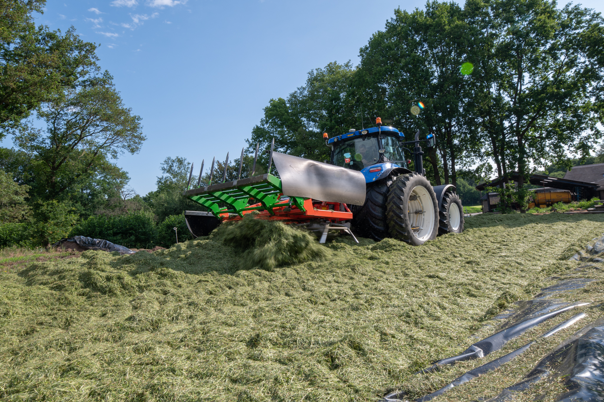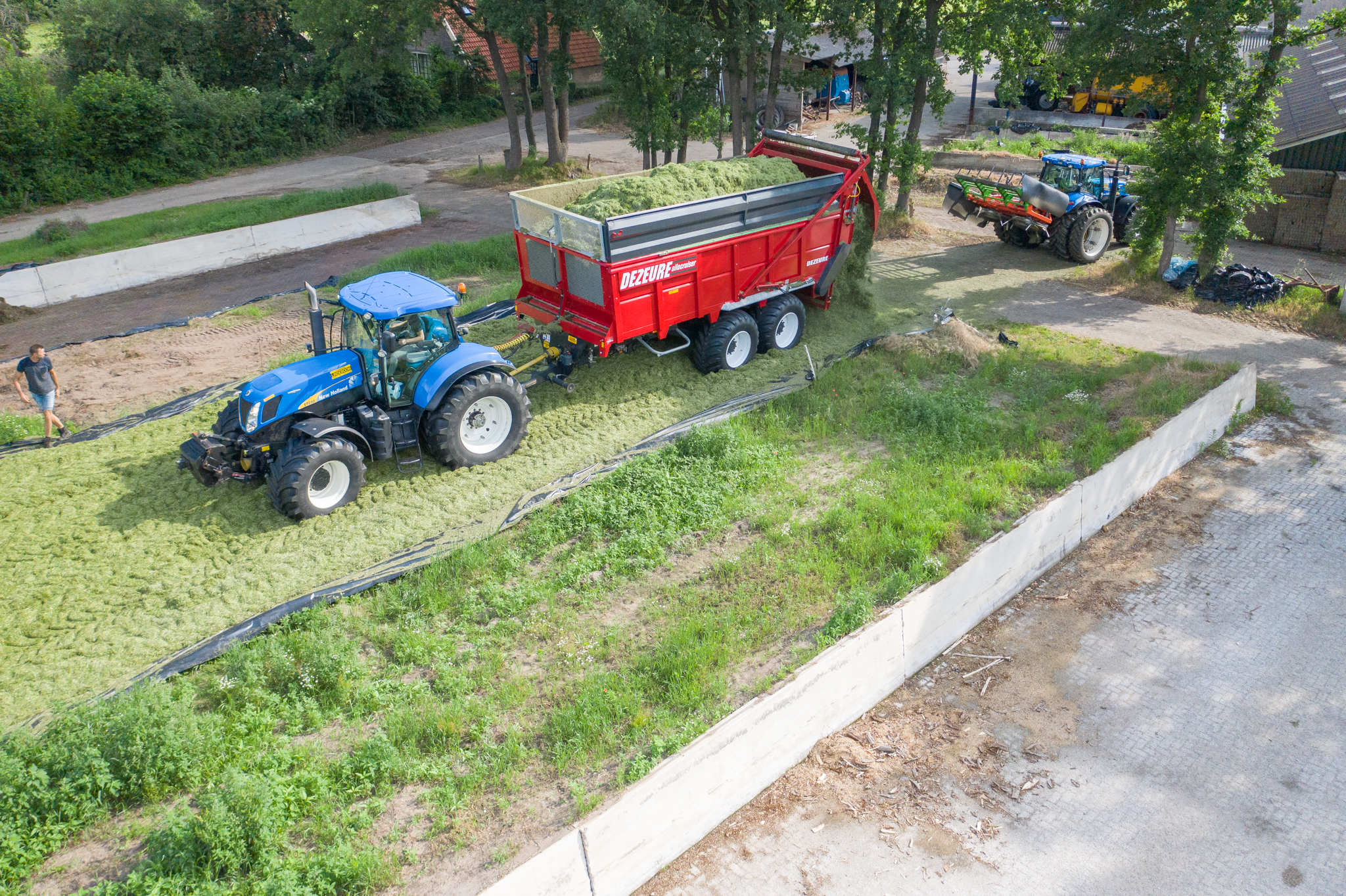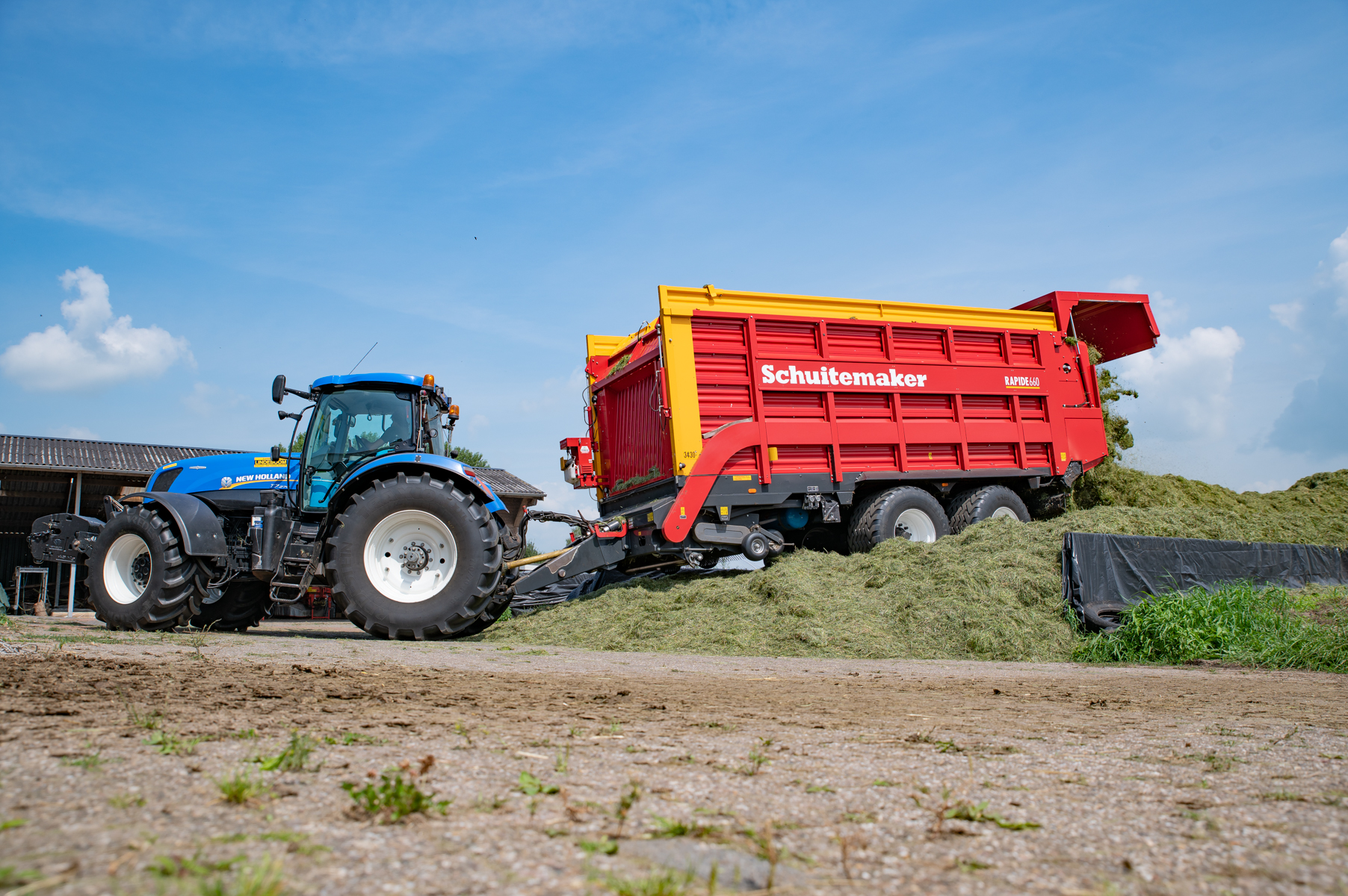 Wij beschikken over 3 Schuitemaker Rapide-opraapwagens waarvan 1 uitgevoerd is met een gestuurde 8 wielige tandem. Deze wagens hebben een invoer met 40 messen. Het eindproduct aan de bult is goed vergelijkbaar met gehakseld gras. In overleg kan de bult met een shovel of zware trekker worden aangereden.